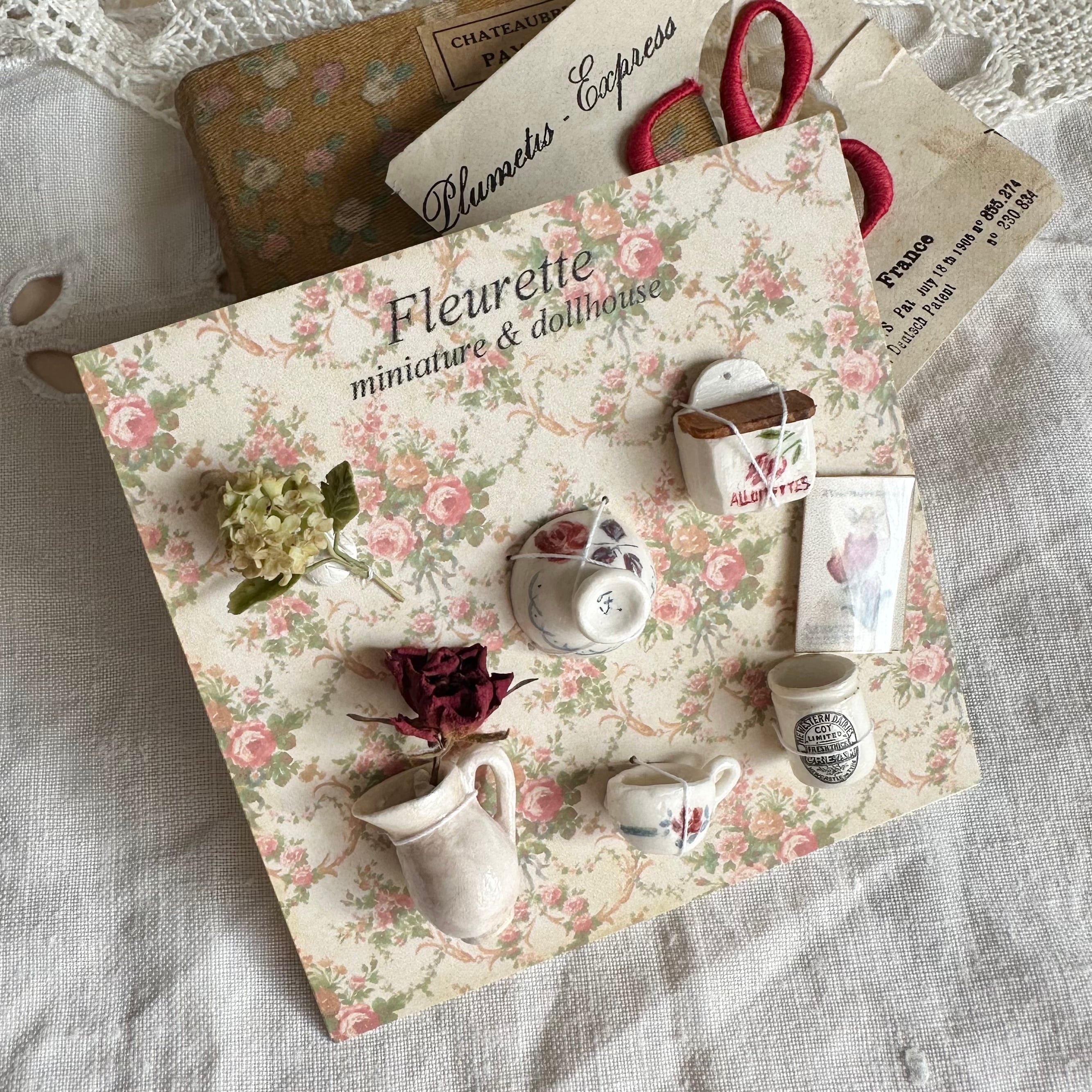 カフェオレボウルなど、粘土製の食器5点と紫陽花などシートに飾りました。プチブライスやミニチュアサイズのぬいぐるみなどと遊ぶのに、ぴったりな12分の1スケールです。
