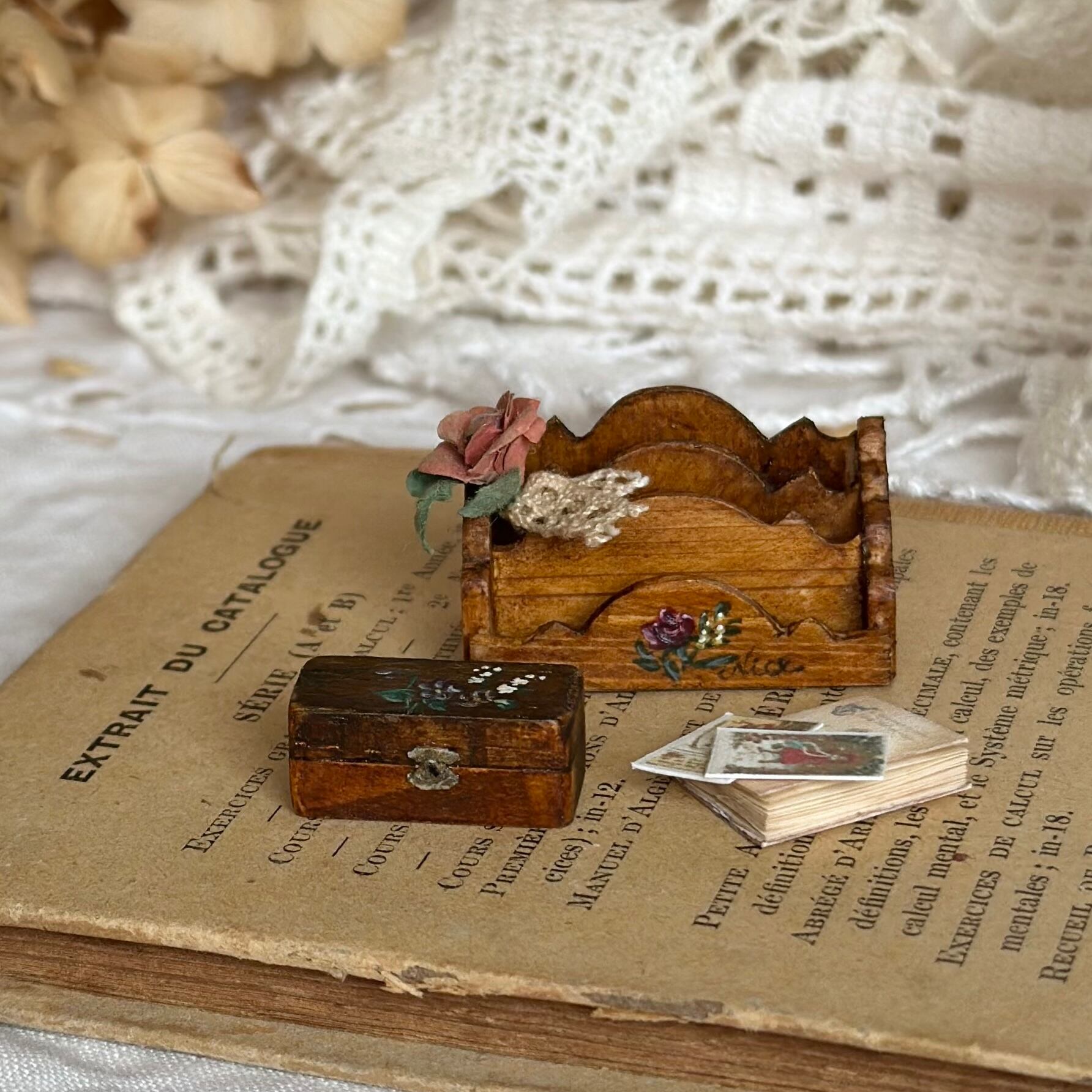 モシュリンヌのレターラックと小箱のSetになります。アンティークの布花に見立てたバラなど画像のもの全てです。小箱は開閉できません。
